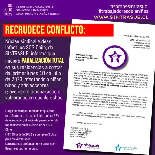 Desde Sindicato de Interempresa Nacional de Trabajadoras y Trabajadores Subcontratados del Servicio Nacional de Menores (Sintrasub), representado especialmente por el núcleo sindical Aldeas Infantiles SOS Chile, anunció el inicio de una paralización total de sus residencias este próximo 10 de julio.