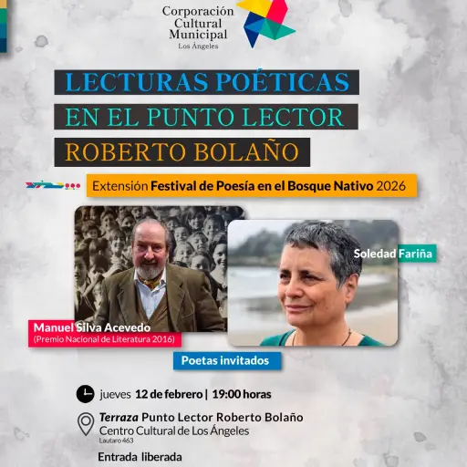 Una nueva instancia cultural orientada a la difusión de la poesía contemporánea se desarrollará durante febrero en la comuna de Los Ángeles. Se trata de la actividad "Lecturas Poéticas en el Punto Lector Roberto Bolaño", iniciativa que forma parte de la programación extendida del Festival de Poesía en el Bosque Nativo 2026 y que busca acercar la creación literaria actual a la comunidad local.